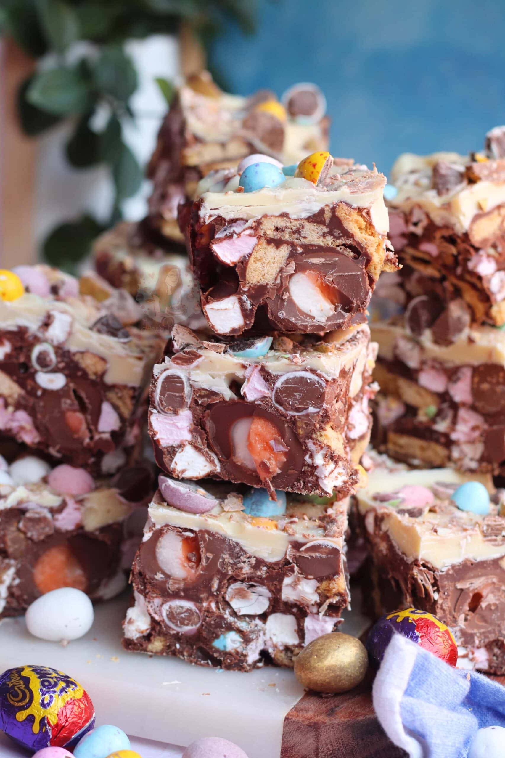 A delicious No-Bake Easter Rocky Road, packed full of all things sweet. Mini Eggs, Creme Eggs & more!