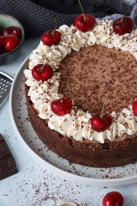 With a chocolate biscuit base, chocolate cherry kirsch cheesecake filling, whipped cream and more, this is the BEST black forest cheesecake