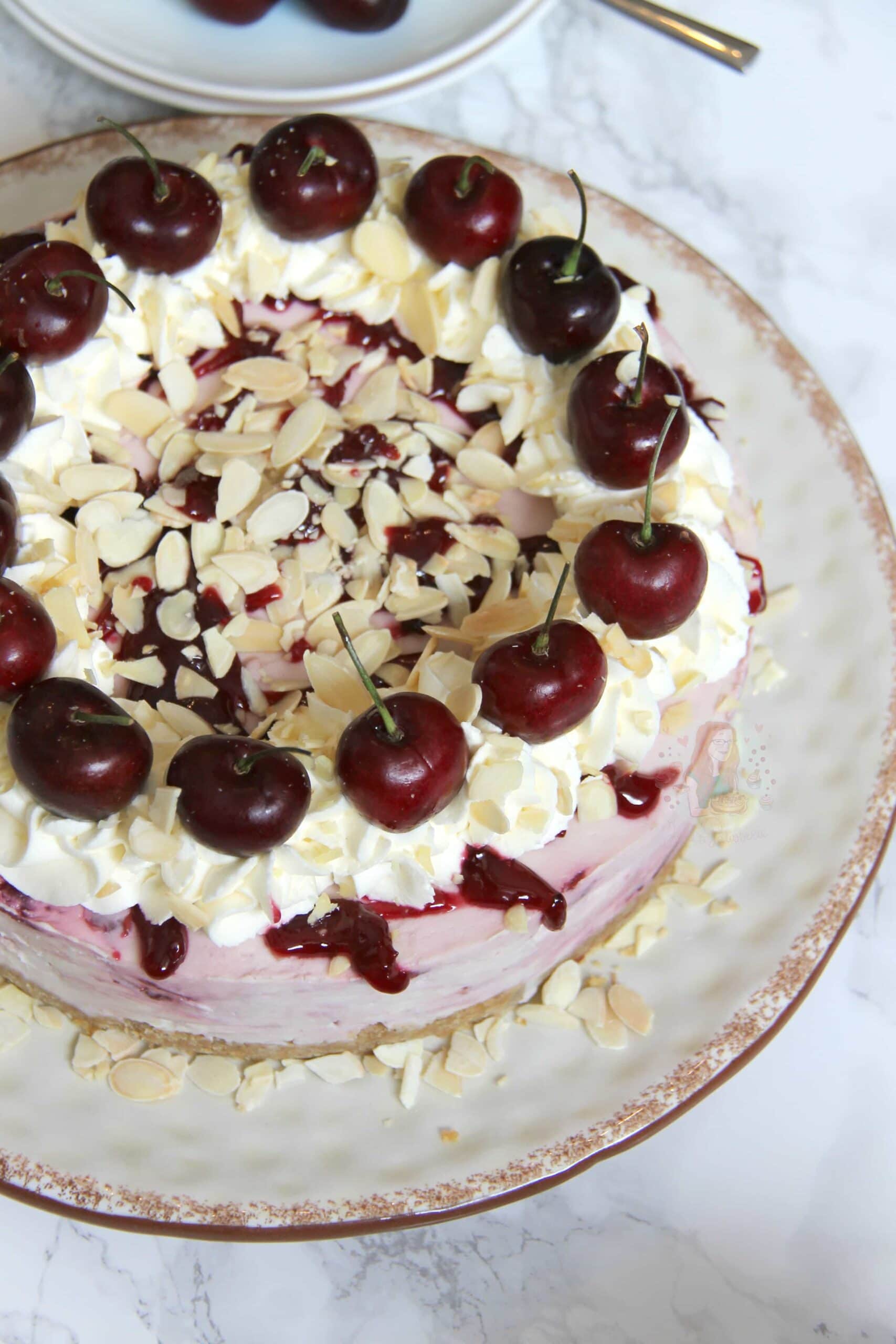 Almond Biscuit Base, Cherry & Almond Bakewell Cheesecake Filling, Whipped Cream, Fresh Cherries, and even more Almond!