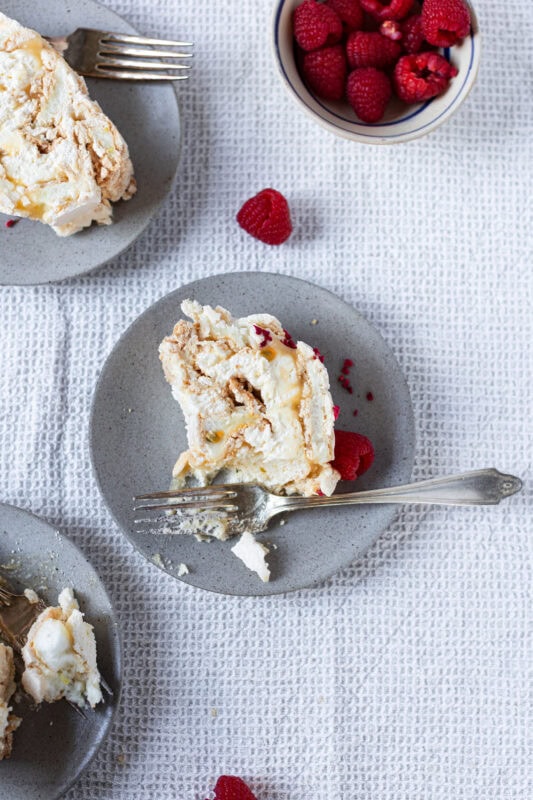 A crunchy, chewy, soft lemon meringue filled with freshly whipped cream, lemon curd, passion fruit, and some freeze dried raspberries to decorate. A delicious lemon meringue roulade!