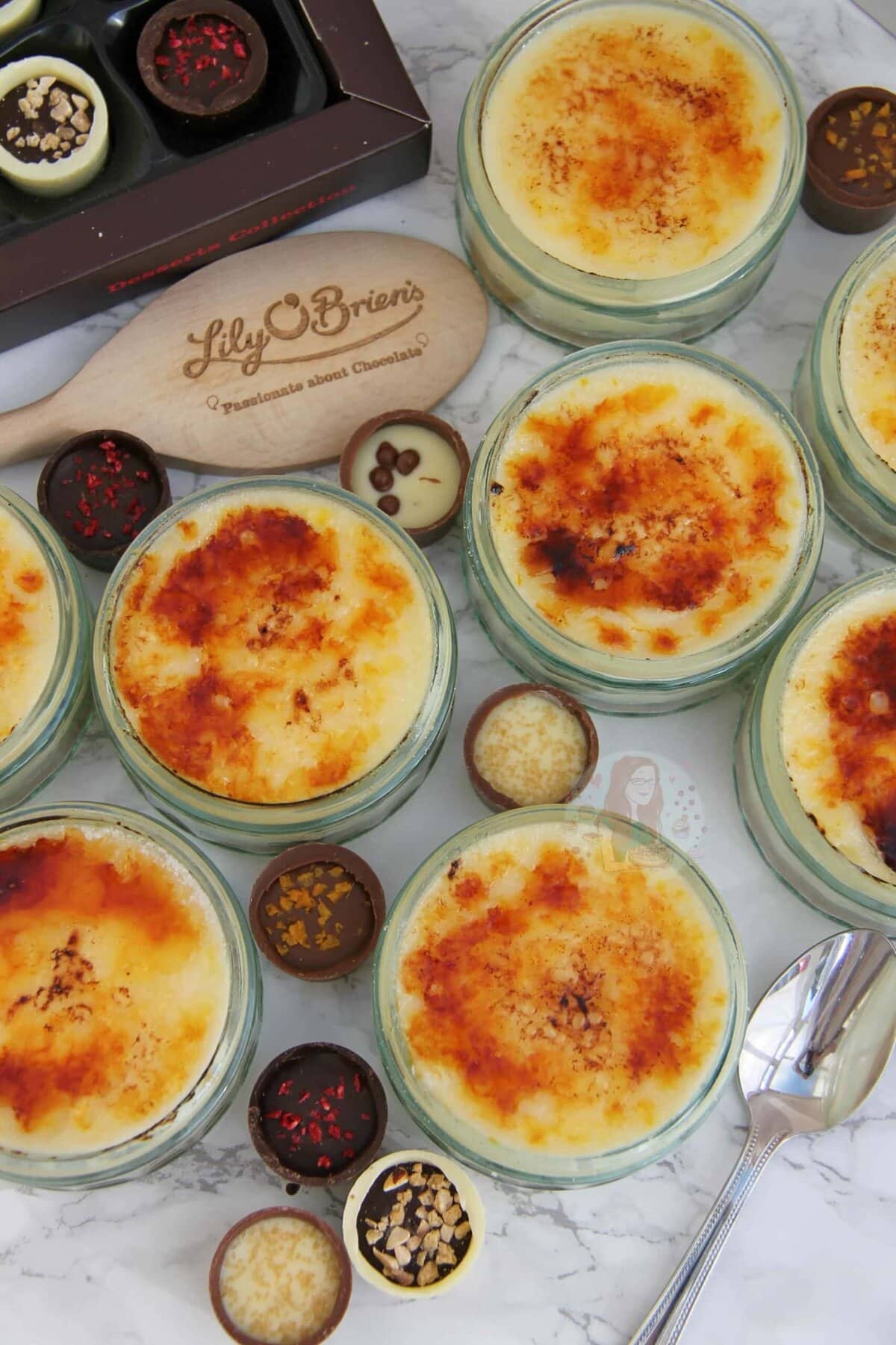 This dessert was inspired by Lily O’Briens dessert collection of chocolates. Honestly, it was a struggle to pic a dessert as I wanted to do them all. They have some delicious chocolates in the collection such as hazelnut torte, passion fruit posset, banoffee pie, creme brulee, raspberry infusion and key limey pie, and they are all DELICIOUS. I’ve got various recipes already on my blog that could be linked to these, however the creme brûlée just jumped out at me as its something I adore.
