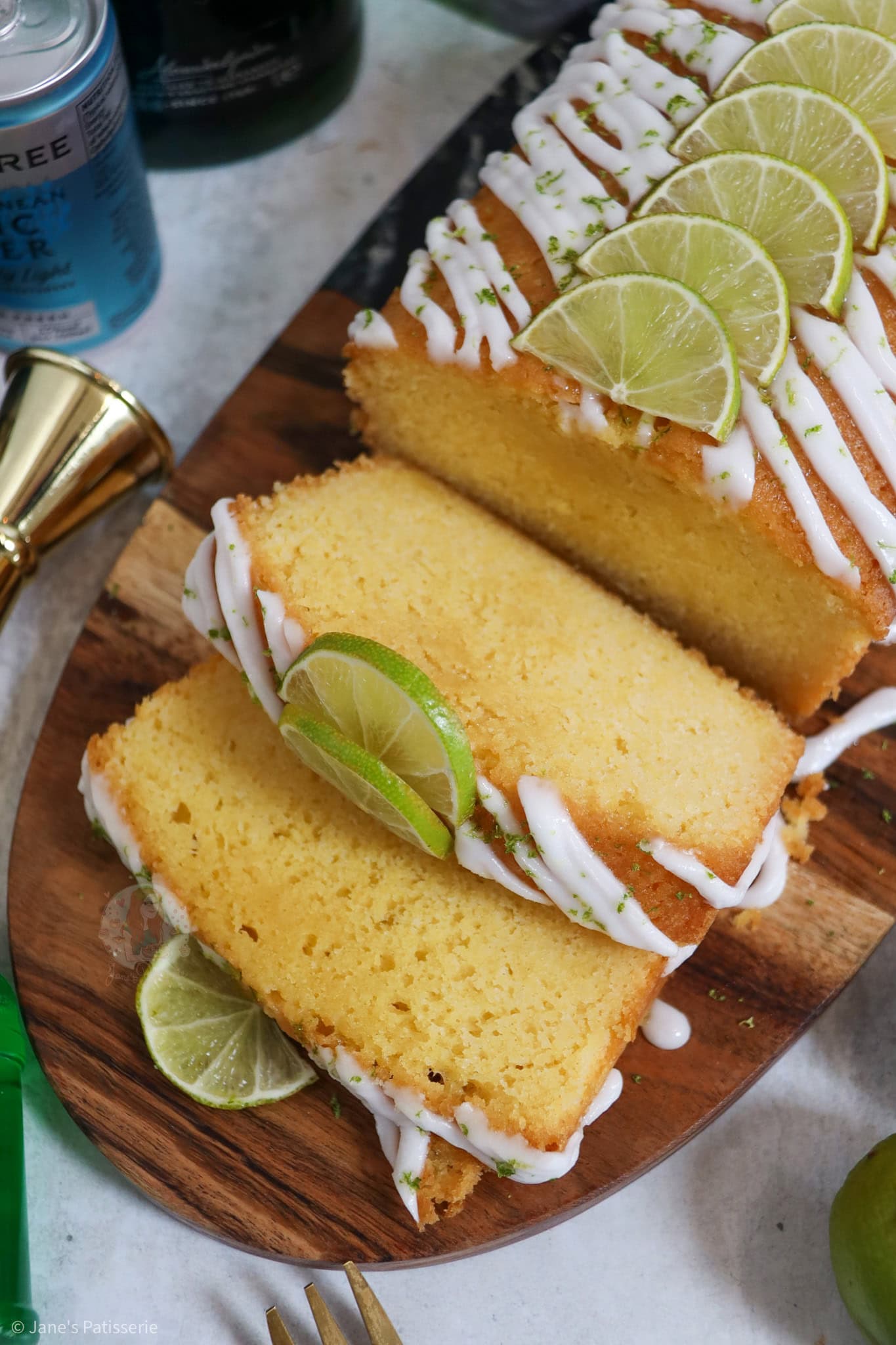 A delicious gin & tonic drizzle cake with a lime sponge, gin & tonic drizzle, gin icing, and lime!