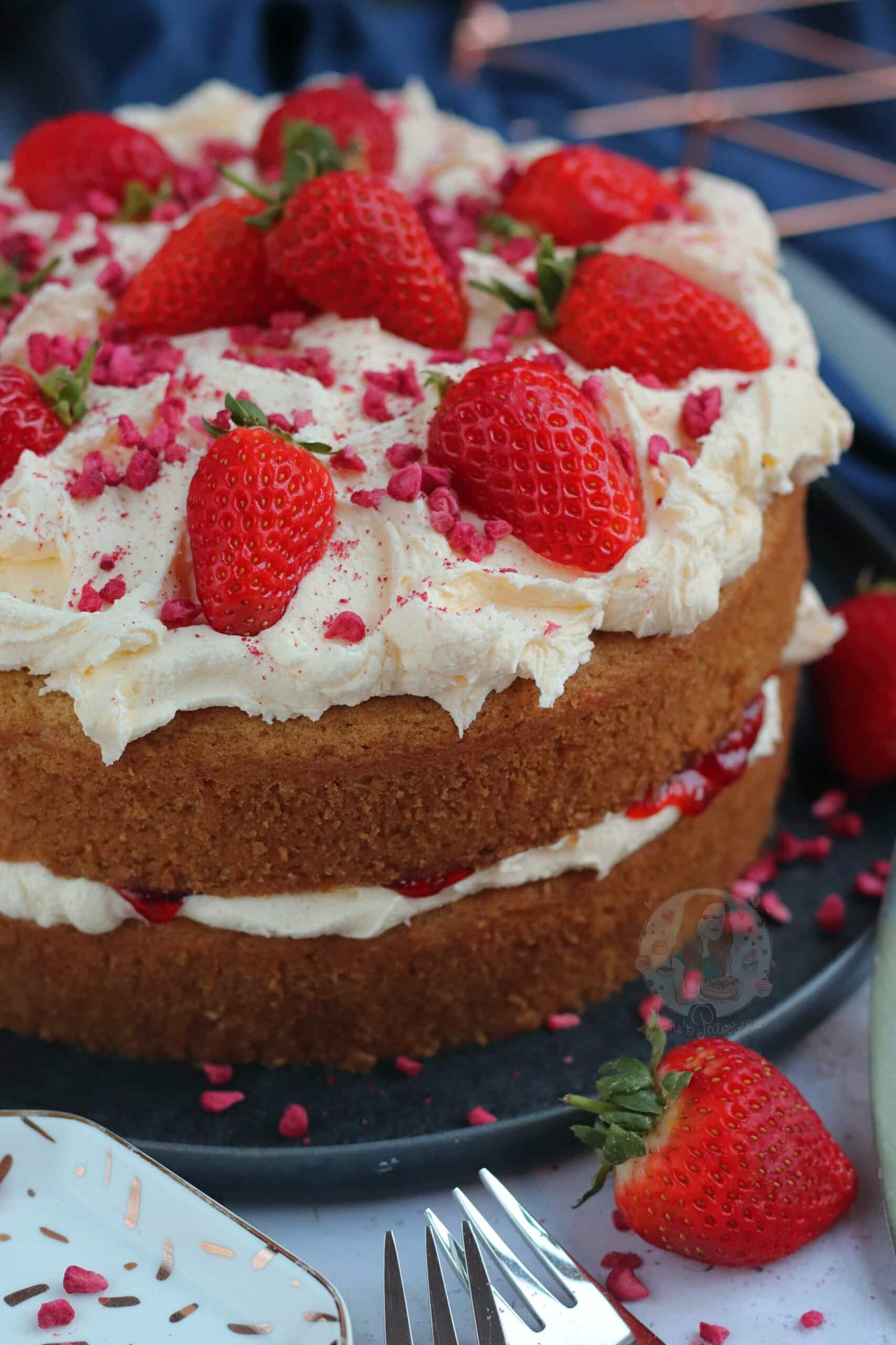 A delicious two-layer vegan Victoria sponge with vanilla buttercream frosting, strawberry jam and more!