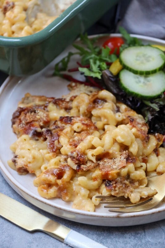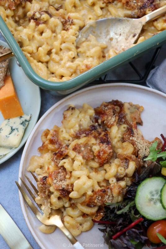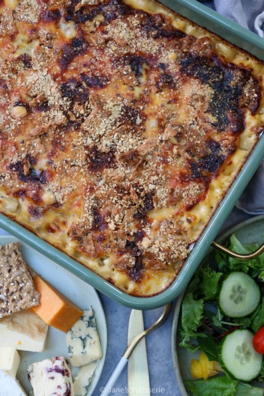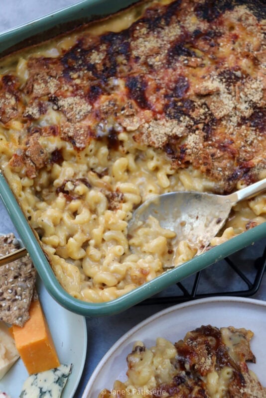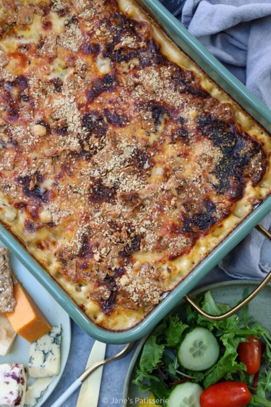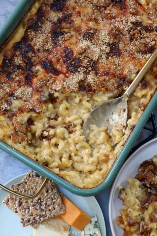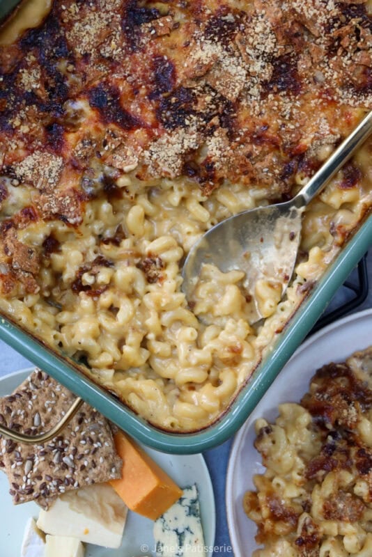 I pour the cooked pasta into my baking dish, and then pour on the cheese sauce. Stir this together, and then you can either bake now, or finish it off like I do. To make it even more cheeseboard like, I dollop on some small spoonfuls of chutney (caramelised onion is my go to choice, and again, always leftover on the cheeseboard) and I also crumble over some crackers for a nice crunch.