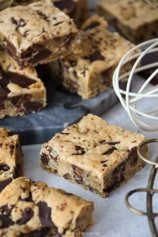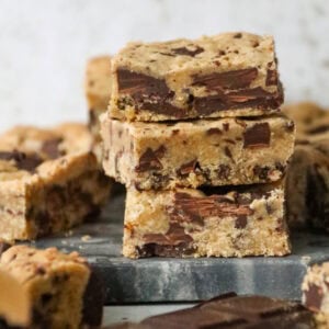 Soft and chewy brown butter cookie bars, stuffed with chocolate chunks throughout, they’re gooey and heavenly in every bite.