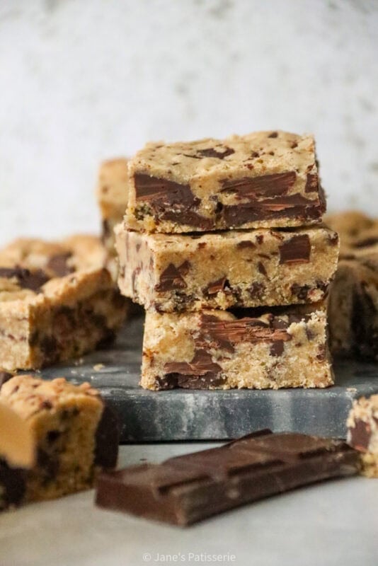Fold through the chocolate chips of choice, and then press into the base of a lined 9” square baking tin. I always use a 9” square tin for a traybake like this because it makes the perfect sized bar and depth of bar too.