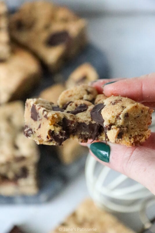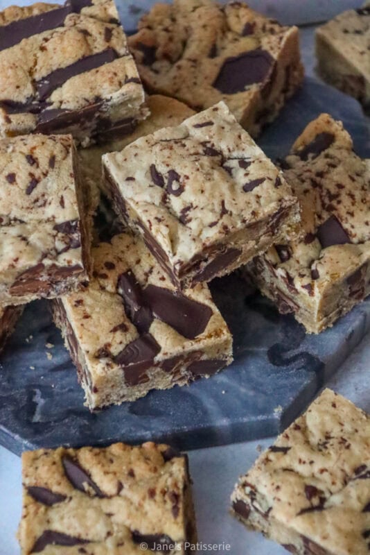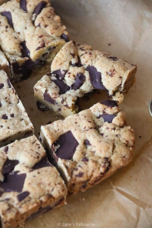 The base of the cookie dough is really the brown butter, and although it will read as having more butter than the standard cookie bar I have made, it’s because some of the weight of the butter disappears during the process of browning the butter.