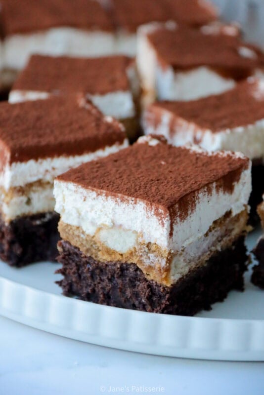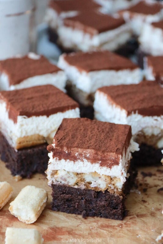 These tiramisu brownies have a fudgy brownie base, coffee soaked sponge fingers and delicious mascarpone cream topping