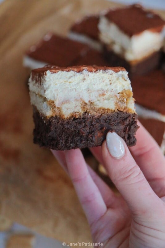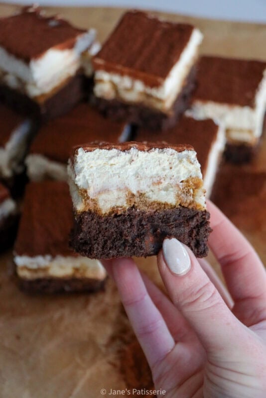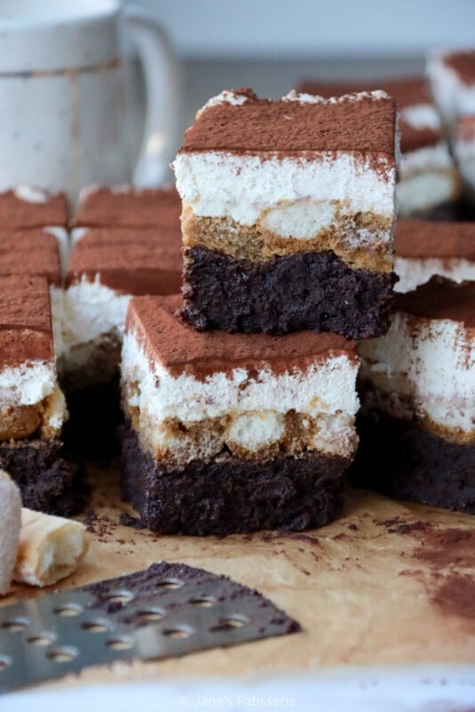 My basic tiramisu recipe is in my third book Everyday, and I make it so regularly. On my blog, I’ve had fun with different tiramisu inspired bakes such as with my favourite ever cheesecake (my tiramisu cheesecake), and also my lemon tiramisu and my tiramisu tart recipes. The combination of flavours in every bake is just THE BEST. Brownies though? That’s a whole level up.