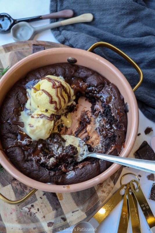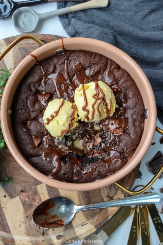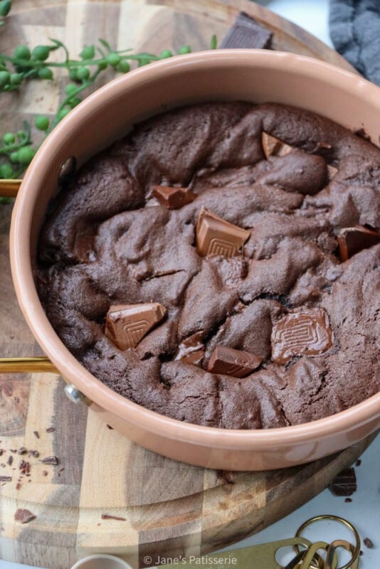 I used a baking dish that was 15cm wide, so anything around that size would work well. A small baking dish, or pie dish is great for this, as ideally you can serve the cookie dough directly in what you have baked it in. (My dish was from Habitat a long time ago)