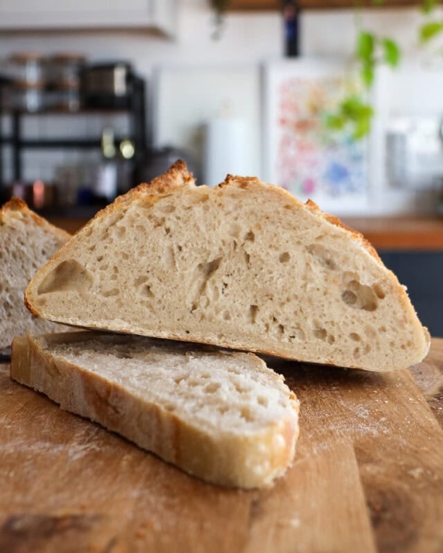 Bake the bread, in the dutch oven, for 30 minutes at 230°c with the lid on (I like to add a few ice cubes into the pot for steam). Then, I remove the lid, lower the temperature to 215°c, and bake for 10-20 more minutes until golden and baked through. The loaf is ready when the internal temperature reaches 98-99°c. Once baked, let it cool for AT LEAST 1 hour before slicing… cutting too early can ruin the bread.