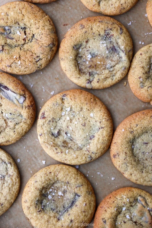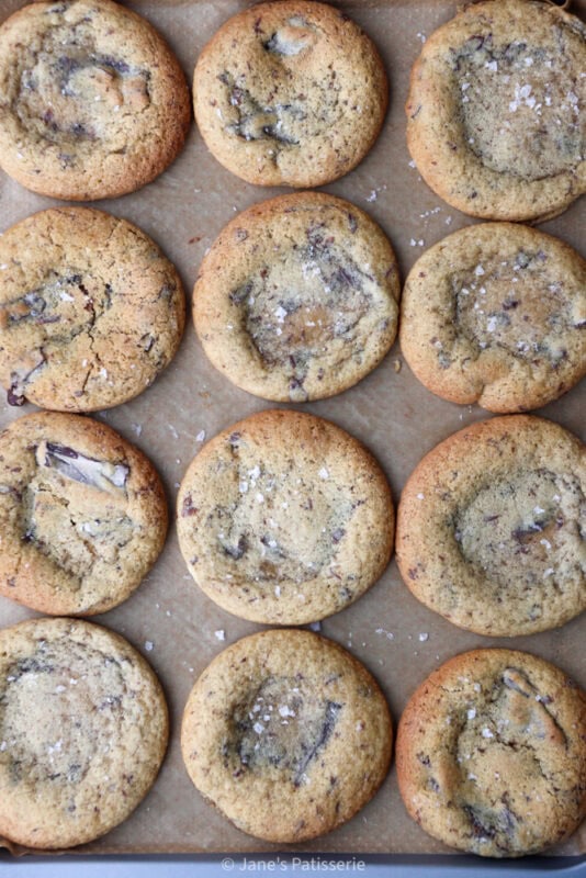 I mix the butter, and sugar together, and then add the egg and vanilla and starter. I like to mix these together quite well so that the ingredients are well distributed, before adding in the flour, bicarbonate and salt. The cookie dough looks a little soft in comparison to other cookie recipes such as my NYC Cookies, but it’s meant to be.