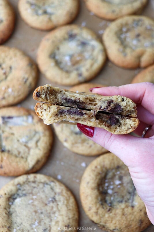 I used a 5cm cookie scoop when portioning the cookies, but you can also just use tablespoons. The dough is sticky so it’s hard to portion with your hands. Add to lined trays, chill the dough, and then bake in a preheated oven. They will soften once cooled, but trust me, they’re gloriously delicious