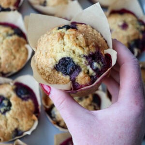 If you’re a sourdough baker like me, you probably have some sourdough discard lying around, and these easy to bake sourdough discard based lemon and blueberry muffins with a brown sugar topping are one of the best discard recipes I have made so far