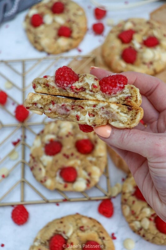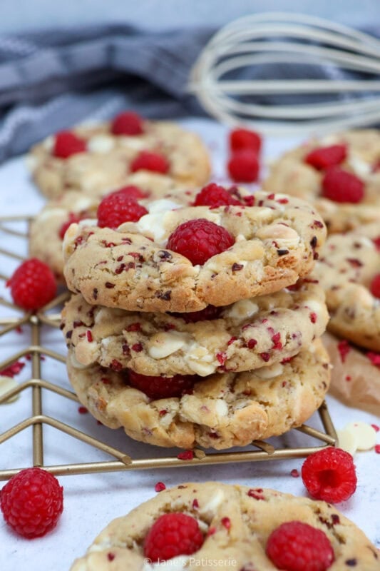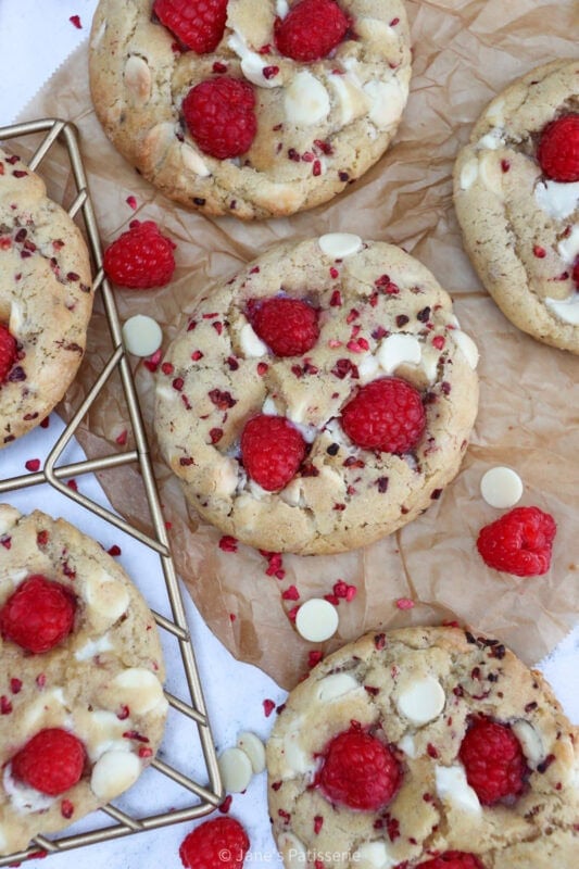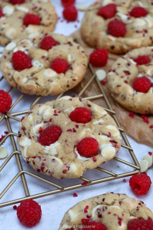 I will always post recipes that my followers ask for, and this one is definitely one of them. These cookies have a sweetness from the white chocolate, with a natural sharpness from the raspberry. For a better texture, freeze dried raspberries are best in the dough, with fresh raspberries on top for decoration.