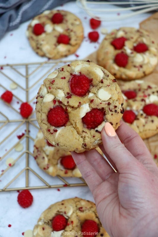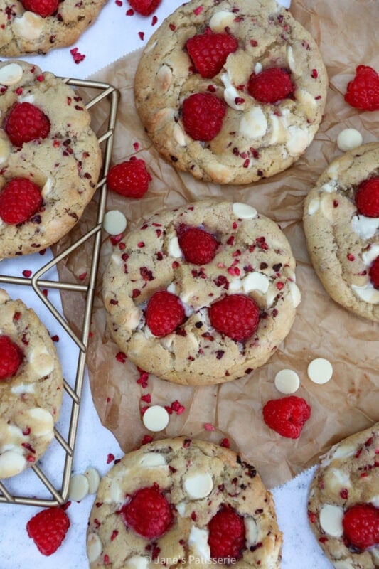 White chocolate chunks, freeze dried raspberries and fresh raspberries to decorate they are show-stopping cookies, that have a crunchy/chewy outside, and a soft gooey middle.