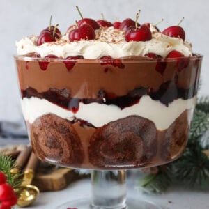 If you want the trifle to be alcohol free, use cherry juice to soak into the cherries, or more easily you can switch the kirsch soaked cherries to more jam or a tin of cherry pudding mix.