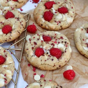 An easy and delicious white chocolate chunk and raspberry new-work style cookie recipe with fresh raspberries on top